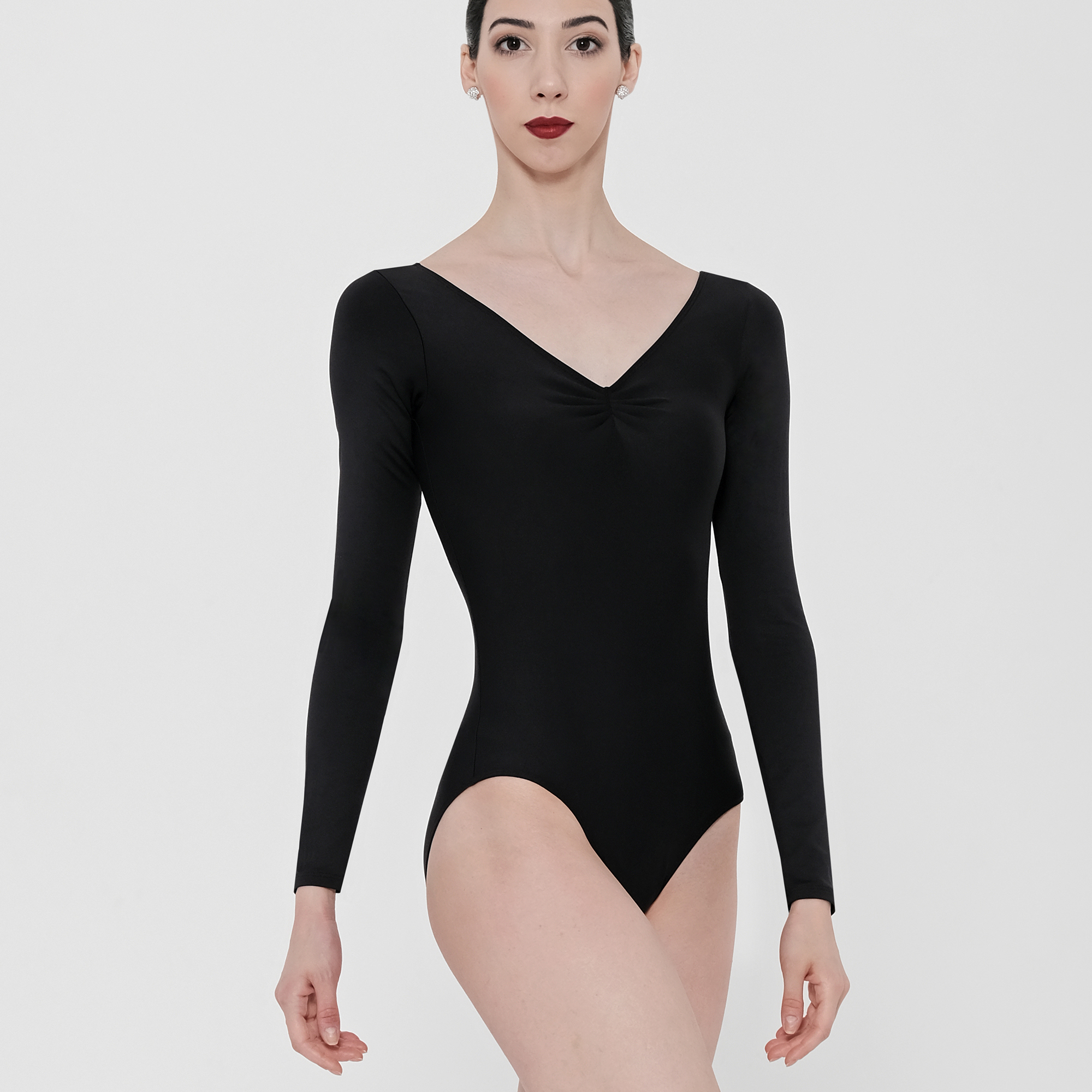 Modelo clásico de manga larga en microfibra con escote recogido y cuchara trasera.